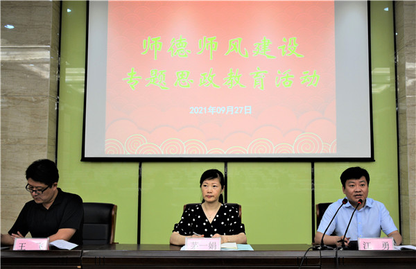 为进一步深入开展理想信念学习教育活动,进一步强化教师师德师风建设,加快依法治教、依法执教进程,形成以身垂范、以德施教的良好风范。9月27日上午,电信系与财贸系全体教职工在E楼精匠报告厅进行师德师风建设专题思政教育活动,会议由电信系主任江勇主持,副校长茅一娟、财贸系主任王飞出席会议。