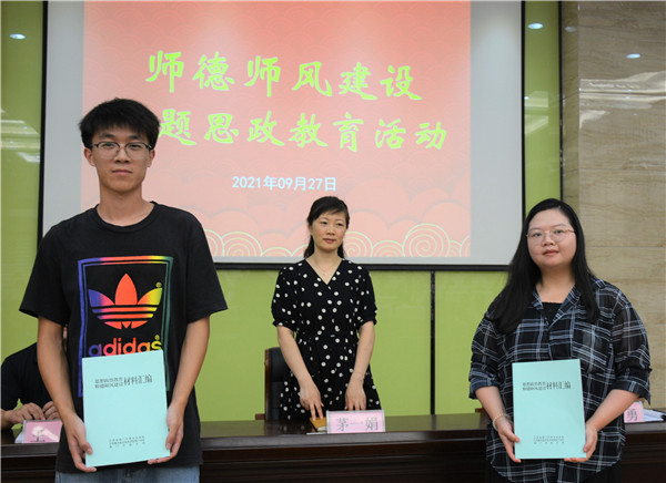 接着茅校长为电信系、财贸系两位新入职教师赠送师德师风学习资料,鼓励新入职教师加强思想政治教育与师德师风建设学习。