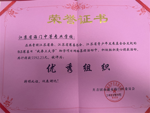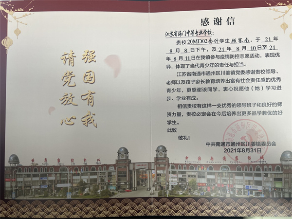 疫情防控 感恩有你——海门中专学子收到区镇党委感谢信 近日,我校收到了来自江苏省南通市通州区川江镇党委的感谢信,信中提及我校经贸系20MD02会计专业学生顾赛南和21MZ07烹饪专业学生黄春熠两位同学参与暑期疫情防控志愿活动,表现优异,特此写信表彰。 两位同学在酷暑下穿着防护服汗如雨下,不厌其烦登记每一位前来核酸检测的人员信息,不分昼夜在疫情防控卡点验码测温,不漏一人核实重点人员行程轨迹。 作为当代青年中职生,海专学子深知自己的责任和义务,在保护自己的同时,尽己所能,去帮助他人。在疫情防控期间,海专学子积极响应党的号召,积极参与疫情防控志愿服务活动,以实际行动践行初心使命,为自己的家乡贡献一份力量! 疫情防控是对国家治理体系和治理能力的一次实战检验,也是广大青年践行初心使命、体现责任担当的试金石和磨刀石。 弘扬公益善举 爱心传递力量——海门中专获评优秀组织 近日,在共青团江苏省委、江苏省慈善总会、江苏省青少年发展基金会发起的9.5慈善日“我要上大学”助学项目网络募捐活动中,积极组织爱心捐款活动,共计捐款5592.23元,被评为优秀组织。 爱心是文明的标志。本次捐款活动让同学们懂得了爱心的无价,真情的可贵。同时也折射出了海专师生身上所具有的助人为乐、无私奉献的良好品德,为建设和谐社会做出积极的贡献。