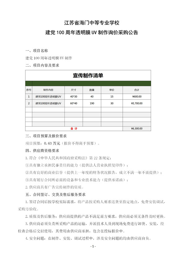 江苏省海门中等专业学校各类宣传品制作询价采购公告