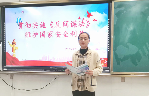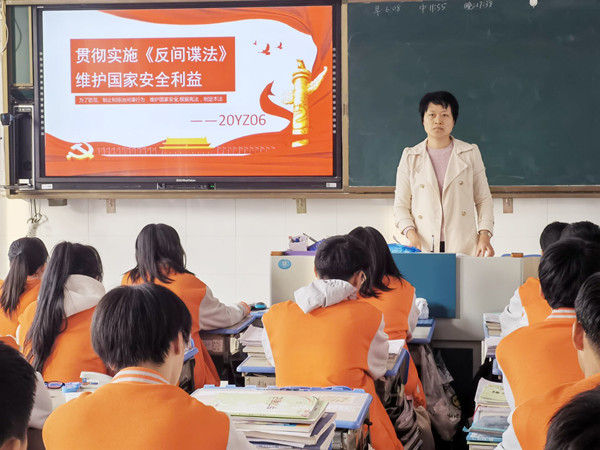 班主任安排同学们观看了《焦点访谈》特别制作的危情谍影,宣传《反间谍法》及其实施细则、《反间谍安全防范工作规定》,普及了国家安全知识,并介绍了当今世界政治格局与国家间微妙而又波谲云诡的关系,让大家了解间谍行为,认识到间谍活动的频繁渗透,要求广大同学提高警惕,认真履行宪法义务,守牢法律底线,坚决维护国家安全。