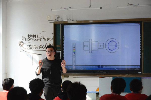 俞洋老师以剖视图相关知识为切入点导入新课,课前事先布置相应预习任务,引导学生自主思考,紧紧围绕“自主、合作、探究”的教学模式开展,他从断面图定义入手,分析断面图与剖视图的不同点,对于重点移出断面图的画法及标注,则鼓励学生根据自己思考和小组讨论结果大胆发言总结,尝试独立画图并发现和解决问题,利用让学生积极思考、主动参与、合作学习等方式培养学生的学习能力。通过给予学生正向激励,独立演示讲授,让学生充满自信和成就感。