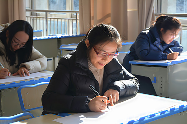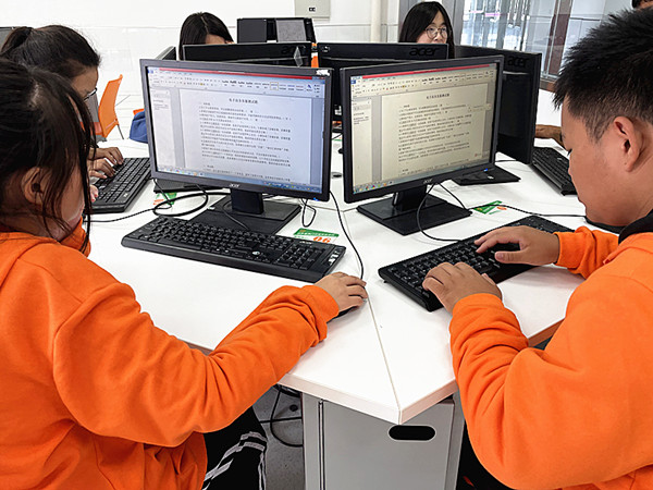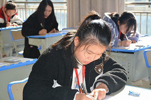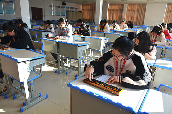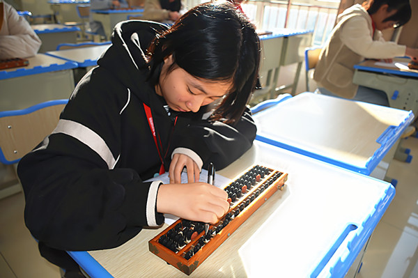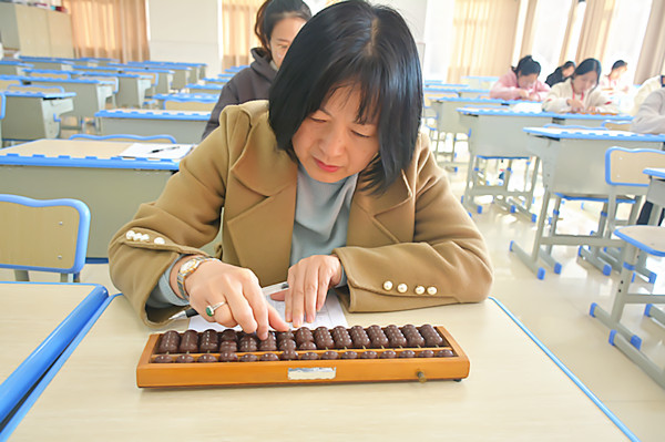 珠算项目考察的是师生的珠算加减法技能,师生们可在一目一行、一目多行、一目三行弃九法中任意选择方法去完成算题。当比赛开始指令发出后,赛场上传来了清脆响亮的拨珠声,师生们个个神情严肃,手指在算盘上飞速地运算,拨珠、清盘的声音不绝于耳。