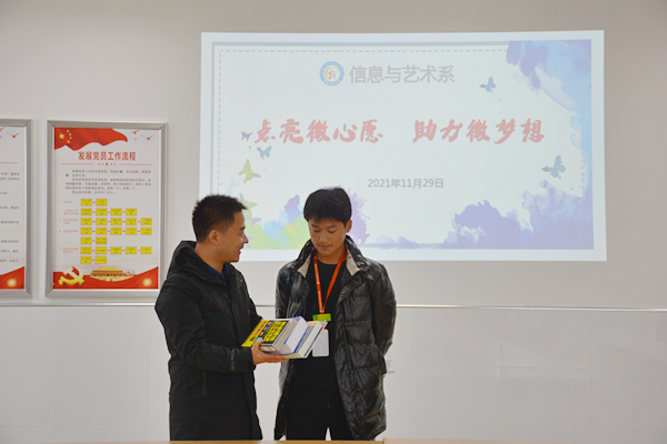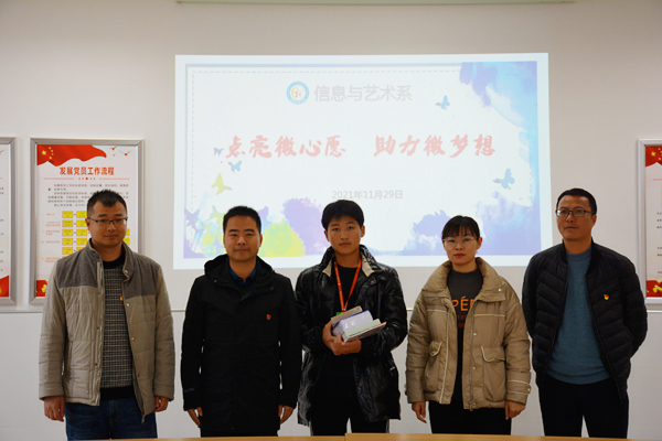 为持续深化党史学习教育成果,推进我系党支部“我为群众办实事”实践活动见行见效,11月29日上午大课间,信息系党支部开展了“点亮微心愿 助力微梦想”活动,信息系党支部徐亮、沈豪杰、王聪同志参加此次活动。