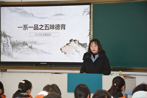 班会活动中,班主任们首先对“五味教育”系部德育品牌以及品牌标志进行了解读,标志中五个颜色鲜明的小人代表了生活“酸、甜、苦、辣、咸”的人生五味,引导学生正确看待生活中的成功与失败,学会胜不骄败不馁。生活离不开调味品,添一份关爱,默默浸润;给一味尊重,轻轻搅拌;加一份善意,慢慢调匀;托一把信任,细细掺和;放温馨环境,悄悄烘烤,希望通过“五味”调和之后,同学们能够养成自信、善良、宽容、乐观、淡泊的品质。