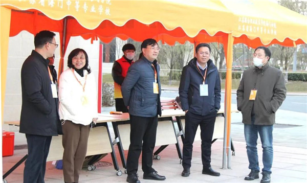 南通市教育局高等教育与职业教育处处长李维(左二),海门区教体局副局长曹慧忠(右三),海门区教体局职社科科长顾靖锋(左一)来校巡查