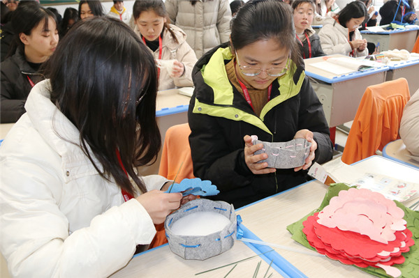 经过期初的申报和调整,海门中专“石榴子”社团联在2月22日下午正式开课。学生工作部和团委对社团开课情况进行了检查。 学生工作部主任张海华,校团委书记杨滨榕、副书记冯勇杰参加了检查。检查以普查和抽查相结合的方式进行,本周重点对经贸系的社团开展情况进行巡查。 巡查发现,各系部基本都能根据社团安排表正常开课;部分社团因疫情防控需要,外聘教师未能到位;部分社团材料没有及时到位,老师开设理论课为学生进行上课。 本学期,经贸系共申报22个社团,其中3个为系级社团。 在云章书法社团课堂上,樊炜老师仔细讲解书法要领,学员们认真听取,并在字帖水洗布上和书法专用纸上进行练习,老师在学生训练过程中对大家的握笔、勾画提出意见。 在花艺社团课堂中,汤国平老师在课前带领学生一起准备花材,在校园里捡拾一些树枝,变废为宝,在老师的精心设计下,一盆美妙的插花便完成了,成为了大家学习的模板。同学们在课堂上用不同的搭配开始尝试,氛围热烈。 在造型气球社团课上,陆丽华老师带领大家做皇冠造型,大家结合老师讲解,跟随视频教程,自己开始动手操作,很快一个皇冠在同学们的手中就完成了。 还有十字绣社团、手工diy社团、巧手坊社团等等,同学们在老师的带领下都开始了社团活动,丰富的第二课堂如火如荼。(供稿:学生工作部)