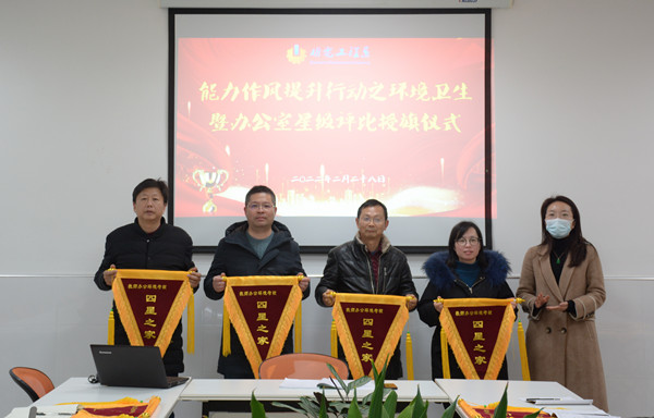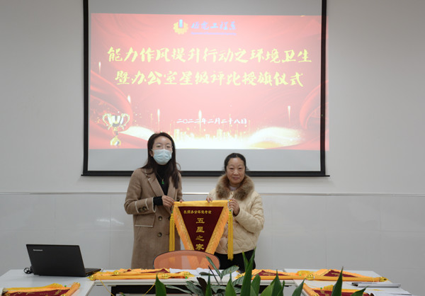 吴樱樱通报了2月份办公室环境检查和打分情况。吴樱樱指出,在全体教师的共同努力下,各办公室在办公环境建设方面都有了质的飞跃,办公室卫生整洁、物品摆放有序、办公氛围浓厚,能力作风建设效果显著。对照学校《教师办公环境考核管理办法(试行)》和“能力作风建设提升年”要求,吴樱樱指出了改进方向,细化了改进措施,要求各办公室进一步完善和长效保持,切实增强办公室凝聚力、执行力和战斗力,打造高品质办公室文化。最后,举行了办公室星级评比授旗仪式。