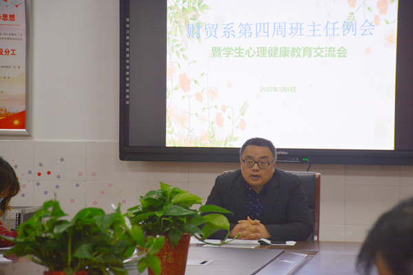 根据学校“能力作风建设提升年”活动精神及要求,为推动和加强系部心理健康教育、管理工作的改革创新,财贸系于3月6日晚18:30,在D226会议室举行第四周班主任例会暨心理健康教育交流会。财贸系全体班主任准时与会,会议由殷志祥副主任主持。