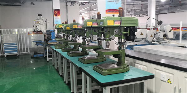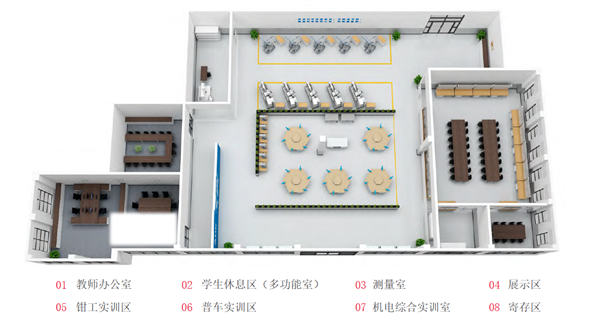 根据机电一体化专业岗位能力需要,积极开展国际合作,建设智能化的设备融入先进的德国双元制职业教育理念,建设机加工实训区域、AHK机电一体化考试中心、作品展示区、讨论区等于一体的具有德国双元制特色的中德培训中心,依据“德国机电一体化、切削机械工职业培训条例”学习领域,德国职业教育与培训研究所BIBB、德国职业教育命题中心PAL的相关要求,以“工学结合“为指导思想,打造实训中心建设主体多元化,满足为学生专业知识与技能培训的需求,同时也满足德国双元制机电一体化专业教学及AHK机电一体化工、AHK切削机械工的职业技能鉴定要求,为推动本校乃至地区职业教育的良好发展,提供专业标准、专业知识、专业技能的持续保障。中德双元制培训中心位于工匠园,面积约780平方米,建有机加工区域、多功能教室、作品展示区、办公区、AHK机电一体化电气考试实训区等6个区域。 一、机加工区域 机加工区域分为钳工实训区、普车区、普铣区、磨床区、台钻区和其它设备区,基本包括了常见的机械加工设备,可以满足学生进行机械加工的基本技能学习。 (一)钳工区 钳工区共拥有5套六角钳工台,配备有铝合金把手的抽屉,抽屉内部可分割成若干块,便于放置工具、量具。每套钳工台有6个台虎钳,可以同时满足30位学生进行实训。 (二)普车区 普车区共拥有5台卧式车床,主要利用车刀对旋转的工件进行车削加工,在车床上还可用钻头、扩孔钻、铰刀、丝锥、板牙和滚花工具等进行相应的加工。 (三)普铣区 普铣区共拥有3台立式铣床,主要指用铣刀对工件多种表面进行加工,通常铣刀以旋转运动为主运动,工件和铣刀的移动为进给运动。它可以加工平面、沟槽,也可以加工各种曲面、齿轮等。 (四)磨床区 磨床区共拥有2台磨床,主要利用磨具对工件表面进行磨削加工。其中一台平面磨床主要用于磨削工件平面;一台外圆磨床主要用于磨削圆柱形和圆锥形外表面。 (五)台钻区 台钻区共拥有6台立式台钻,台钻是一种体积小巧,操作简便,通常安装在专用工作台上辅助钳工使用的小型钻孔加工机床。 (六)其他设备区 其他设备区拥有一台数控立式钻床、一台折弯机,数控立式钻床是由数控系统控制的自动化钻床,常用于机械制造和修配工厂加工中、小型工件的孔;折弯机是一种能够对薄板进行折弯的机器。 二、多功能教室 中心规划建设了多功能教室,可以方便师生交流、学习、谈心,也可以做会议室进行教学分析总结等活动。 三、办公区 办公区为教师准备了数字化资源终端,并且将办公桌设计成面对面办公,有利于教师在备课和科研过程中的交流。 四、数字化教学区 数字化教学区配备数字化教学一体机,搭载安卓和微软双系统,集成无线投影,白板书写,远程会议,文档批注功能为一体,内容支持图片、PPT、Word、PDF可无线投屏,多人同屏互动。 五、作品展示区 本区域放置优秀学生的作品,介绍学生作品的想法和所运用的材料及加工方法,可以使学生之间相互学习共同进步。 六、AHK机电一体化电气考试实训区 AHK机电一体化电气考试平台符合德国机电一体化专业AHK职业资格要求,按照德国VDE电气标准设计,提供相应AHK职业资格考试要求的实训内容,能够完成AHK德国工商大会考试中机电一体化的实践工作任务和考核工作任务。