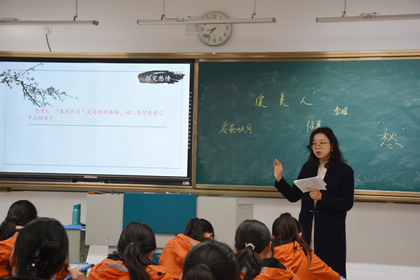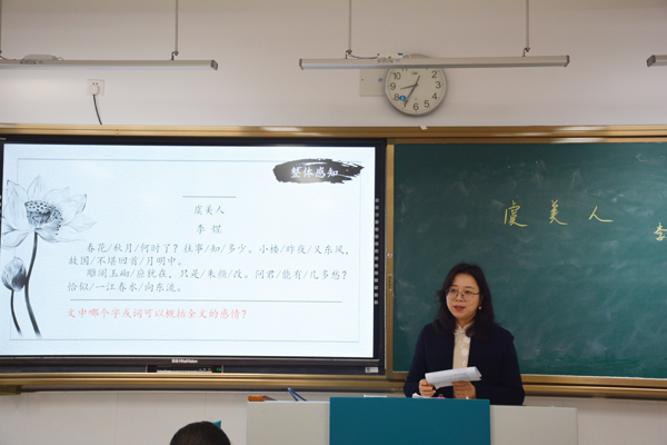 本次公开课课题是李煜的《虞美人》,整堂课可以用“一气”“二有”“三美”三个词概括。“一气”即一气呵成,杨老师在情境导入、诵读体悟、披文入情、涵咏深味、传唱经典几个环节设计上,张弛有度的节奏、声情并茂的诵读、有条不紊的气势、温和清晰的语调,一气呵成。“二有”即有情有味,《虞美人》是唐宋词中的名篇,这首词的灵魂在于深情——词人对故国沁入骨髓的深情,相对于这种深情,任何表现手法只是外壳,这节课杨老师引导学生在知人论世的基础上,剥开层层外壳,深挖最可玩味的内核。一曲有情有味的词,显示了教师的思想深度,也让我们看到了学生身上深藏的潜力。“三美”即韵律美、意境美、情感美,本堂课杨老师突出“读”这一语文课堂教学标志性特点,采用形式多样的朗读,让学生在朗朗书声中走进词人内心,最后对词的哼唱起到了画龙点睛之笔,真切地让学生感受到了诗歌的韵律美。这首词艺术感染力强,杨老师以“读”为主线,循序渐进,层层递进,到最后的品味意境美、情感美是自然流露、水到渠成。