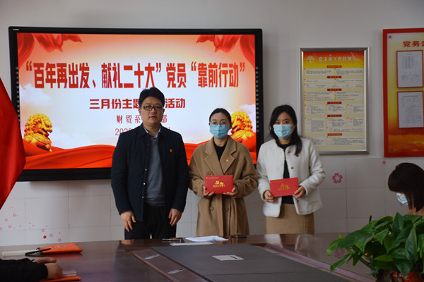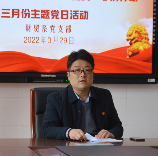 根据海门区委组织部和区委教育工委通知要求,在学校党委统一部署下,财贸系党支部于3月29日上午9:20,在謇公楼226会议室组织开展了3月份“主题党日”活动。本次活动以“‘百年再出发、献礼二十大’党员‘靠前行动’”为主题,由支部书记王飞同志主持,共包括六个议程。
