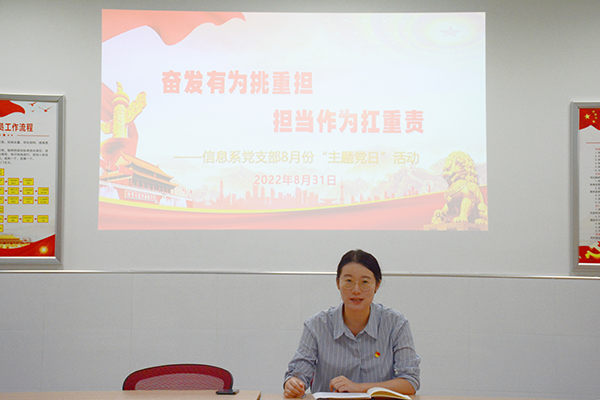 8月31日下午3:40,信息系党支部在书苑232党员活动室开展了“奋发有为挑重担,担当作为扛重责”主题党日活动。活动由支部负责人杨滨榕同志主持,支部全体党员参加。活动共分三项议程。
