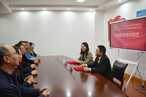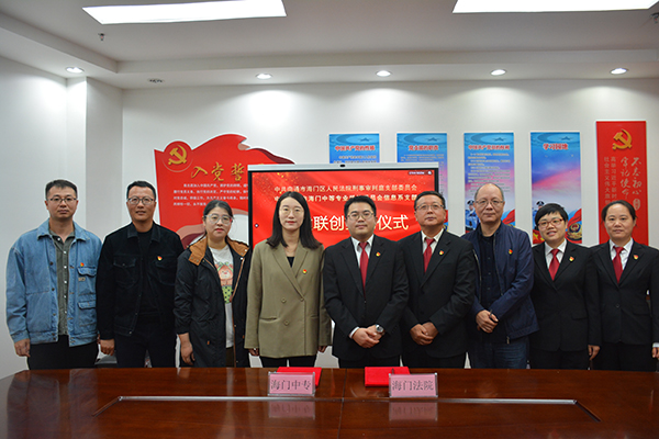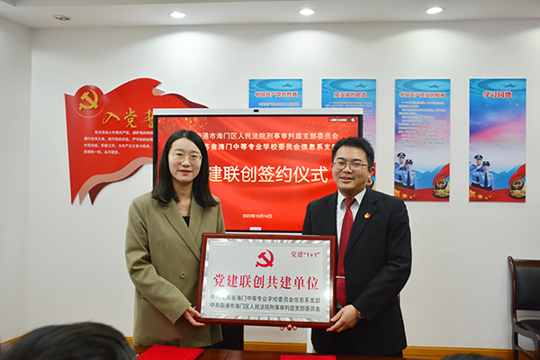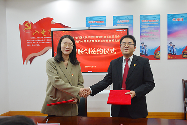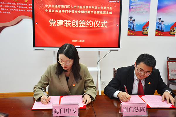10月14日上午,信息支部负责人杨滨榕带领支部代表周莉、沈豪杰、王聪等一行五人前往海门区人民法院,在法院二楼会议室与法院刑事审判庭支部举行结对共建签约仪式。支部负责人杨滨榕与刑事审判庭支部书记彭文甫签订了结对共建协议书。彭文甫主持签约活动。