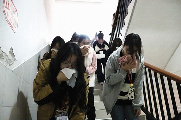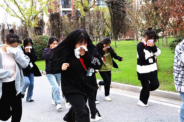 活动由经贸系副主任周晟统一指挥和安排。随着“应急警报”铃声的响起,消防演练正式开始。各班学生在班主任老师的指挥下按要求弯腰,用毛巾捂着鼻子,从学生宿舍区有秩序地按事先的预设路线疏散至学校指定的安全位置北操场,用时2分18秒。整个活动过程通道畅通、疏散有序,无一学生受伤。到达安全位置后,老师们迅速清点各班学生人数,确定学生全部安全。