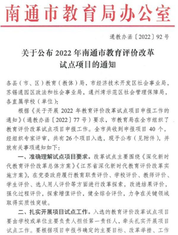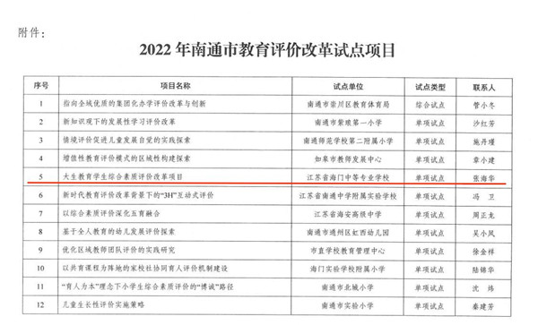 日前,南通市教育局公布2022年南通市教育评价改革试点项目,海门中专“大生教育学生综合素质评价改革项目”入选。全市共有40个项目进行评选,经专家组评审,共有26个项目入选。 海门中专“大生教育学生综合素质评价改革项目”以《深化新时代教育评价改革总体方案》《江苏省深化新时代教育评价改革实施方案》为导向,实践“大生教育”质量管理模式,开发“大生学分银行”,建设“文熹”学生成长平台,建立“五育”成果认证和转换体系,全面构建“五育”综合发展评价方式。 “大生教育学生综合素质评价改革项目”是海门中专在学生评价方面改革探索和全新抓手。评价内容多样化,评价主体多元化,评价手段多维化,对“三全育人”“五育并举”高质量育人工程必将起到积极推动作用。