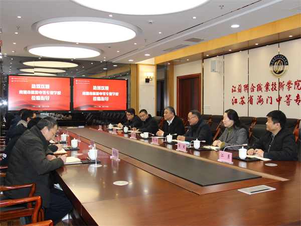 2月16日上午,南通旅游中专党委书记、校长葛刚、副校长吉祥一行五人来校考察交流。我校党委书记宋健、副校长陈小军热情接待,教学工作部、财贸系、电信系相关主任一起参加座谈交流活动。 客人们首先参观校容校貌,重点走进财贸、电信两个系部,了解职教高考教育教学日常情况。随后在科教大会堂观看了我校的宣传视频。