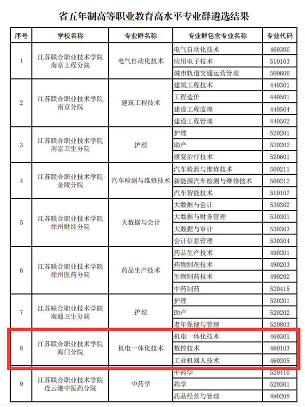 近日,江苏省教育厅公布五年制高等职业教育高水平专业群遴选结果,我校机电一体化技术专业群成功入选。 据了解,五年制高职高水平专业群建设是贯彻落实《国家职业教育改革实施方案》的重要举措,也是高职教育优化类型定位、融入区域发展的主要任务。近年来,海门分院结合学校自身办学优势与特色,主动对接国家和区域主导产业、支柱产业和战略性新兴产业,适应产业转型升级需求,扎实推进专业建设,在人才培养、校企合作、产教融合等方面屡获突破。此次成功入选省高职高水平专业群,是对我校机电一体化技术专业群建设的极大肯定与鼓舞。学校将以此为新起点,立足发展新阶段,贯彻发展新理念,乘势而上,主动服务发展新格局,努力培养更多优秀人才。