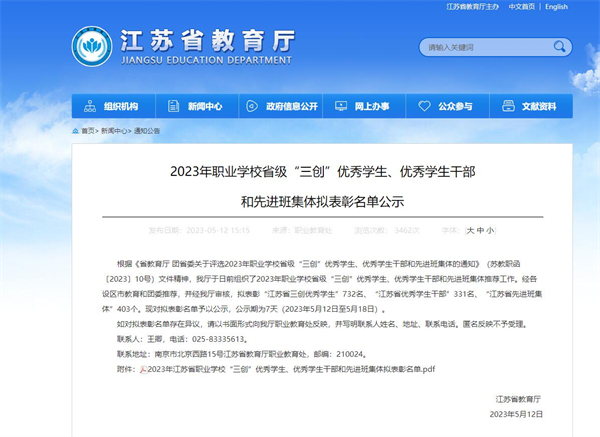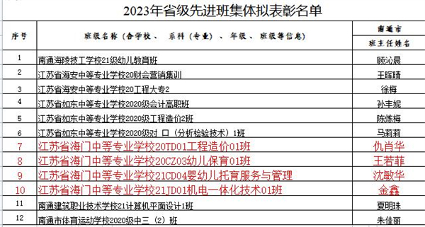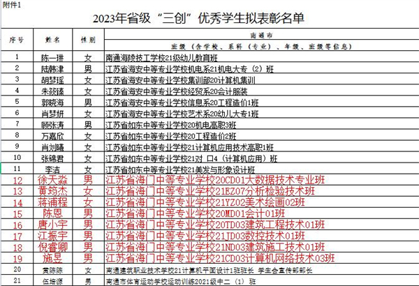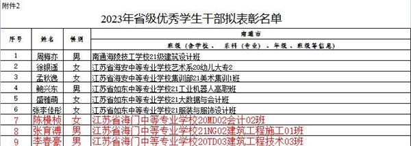 近日,江苏省教育厅2023年职业学校省级“三创”优秀学生、优秀学生干部和先进班集体拟表彰名单公示,海门中专徐天淼等8名学生获评省“‘三创’优秀学生”,陈槾桢等3名学生获评省“优秀学生干部”,20TD01工程造价01班等4个班集体获评省“先进班集体”。让我们一起向获奖个人和集体表示热烈祝贺。