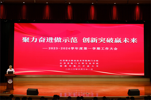 8月31日上午,我校2023—2024学年度第一学期工作大会在謇公湖科教大会堂召开。会议围绕“聚力奋进做示范 创新突破赢未来”的主题,立足新发展阶段重点目标,凝心聚力、务实高效,为推动学校在高质量发展路上开新局、谱新篇指明了方向。校党委副书记、副校长周桂岐主持会议。