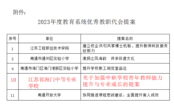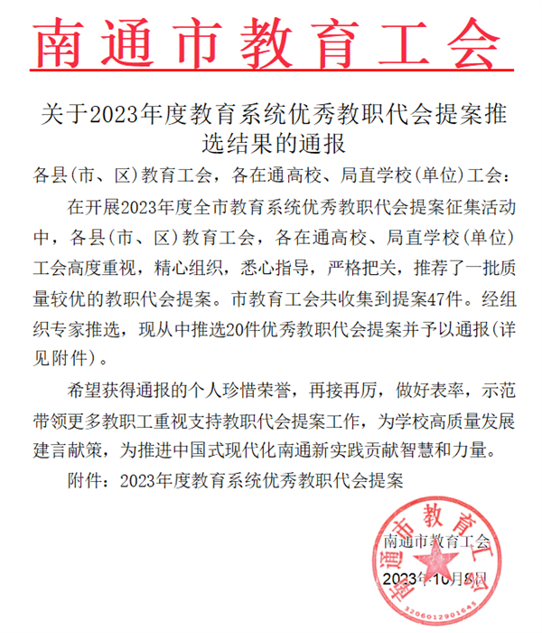 10月8日,由南通市教育工会组织的“2023年度教育系统优秀教职代会提案征集活动”公布评选结果,我校推荐的《关于加强中职学校青年教师能力提升与专业成长的提案》入选2023年度教育系统优秀教职代会提案,从推选的47件提案中脱颖而出。