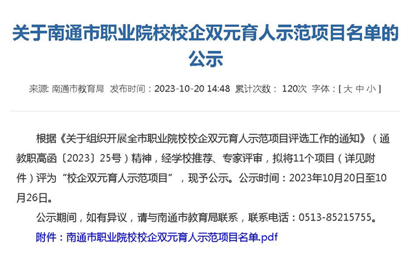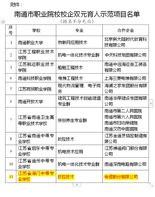 10月20日,南通市教育局网站发布关于南通市职业院校“校企双元育人示范项目”名单的公示,海门中专(数控技术专业)与希诺股份有限公司校企合作育人项目上榜。
