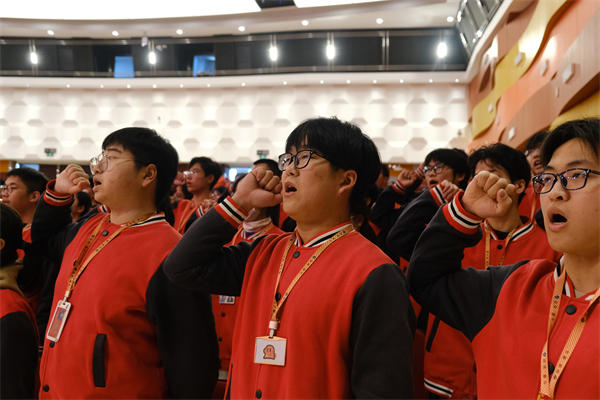 课堂最后,全体学生紧握右拳,以青春的名义宣誓,要用理想“逐梦青春”,传播正能量;要用学习“点亮青春”,不负好时光;更要用品格“涵养青春”,走好人生路。