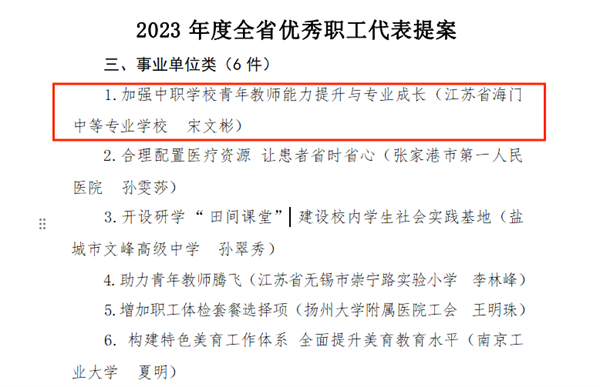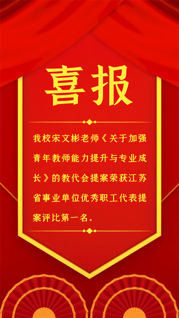 日前,我校宋文彬老师《关于加强青年教师能力提升与专业成长》的教代会提案喜获江苏省事业单位优秀职工代表提案评比第一名。全省事业单位类优秀职工代表提案仅6件。