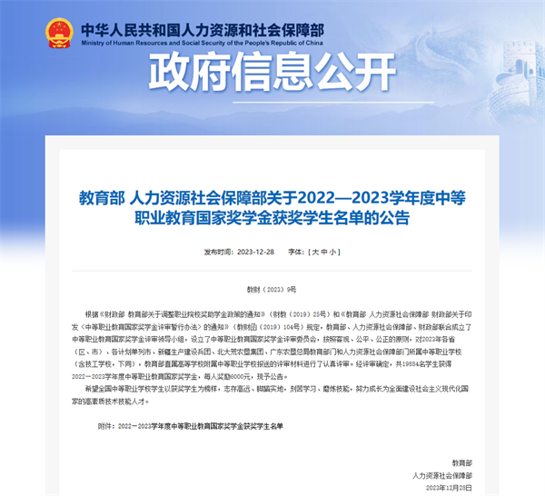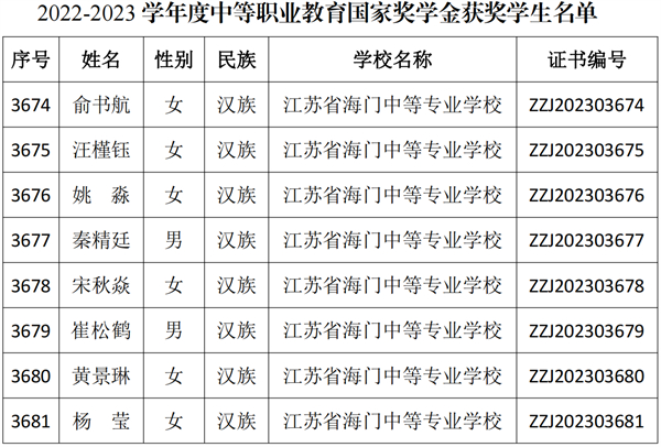 喜讯传来!近日,教育部、人力资源社会保障部公布2022—2023学年度中等职业教育国家奖学金获奖学生名单,海门中专俞书航等8名学生喜获中职国家奖学金。