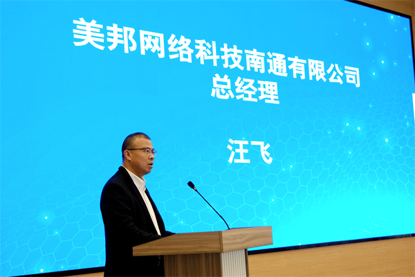 汪飞致欢迎辞。他介绍了美邦网络科技南通有限公司和叠石桥科技产业园的基本情况,表达了深化校企合作,建立健全长效机制,形成互利共赢发展格局的愿望。