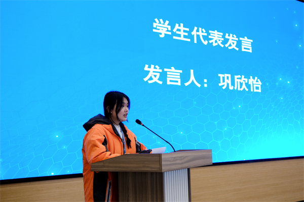 信息工程系20CD01班巩欣怡作为学生代表上台发言,感谢学校与企业为学生成长创造了广阔平台。她表示,未来将以最好的综合素质,发挥创新创业激情,为社会进步与发展创造新价值,做出新贡献。