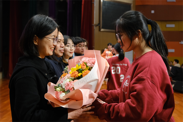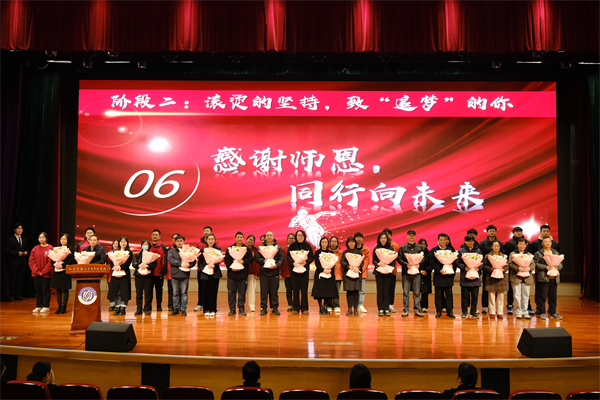 学生代表向全体任课教师献上鲜花,感谢老师们的倾囊相授与谆谆教诲。师恩难忘,日夜兼程的陪伴让全体学生有了奋勇拼搏、砥砺前行的强大勇气与自信。