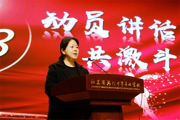 杨一丹作动员讲话。她鼓舞同学们“满怀希望,充满必胜的信心”“稳扎稳打,保持高度的细心”“自我减压,以平常心对待高考”。她寄语同学们要具有“海到无边天作岸,山登绝顶我为峰”的壮志豪情,在樱花烂漫的三月奋力开拓未来,努力拼搏,共圆本科梦。