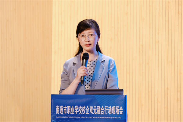 海门中专党委副书记、校长茅一娟作校企双元融合工作汇报。茅一娟从强力推进“双能”师资建设、有序开展“双模”课程研发、真实创设“双场”教学情境、探索构建“双元”教学模式四个方面介绍了海门中专作为南通市新职业教育校企双元融合行动的牵头学校,全力推进南通市新职业教育“六大行动”,大力推进校企深度交流合作,在校企双元融合、构筑理想课堂方面的积极探索和成功实践。