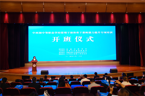 10月20日—21日,由苏州大学新教师基金主办、南通市海门区新教育培训中心承办、中华同心温暖工程基金会资助的中西部中等职业学校管理干部和骨干教师能力提升专项培训活动在南通市教育局指导下在海门中专如期举行。本次培训活动结合新时代职业教育的使命和担当,聚焦能力提升,通过专家讲座、现场调研、观摩研讨等多种形式,全方位提升了学员的综合素养。 开班动员 赋能品质发展 10月20日上午,开班仪式在海门中专謇公湖科教大会堂举行,南通市教育局职业教育与高等教育处处长李维主持开班仪式。