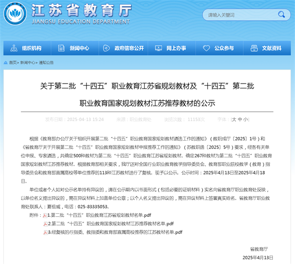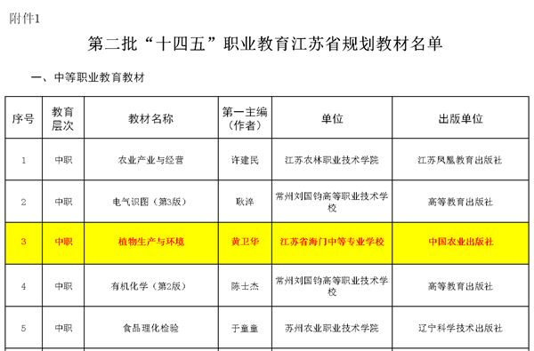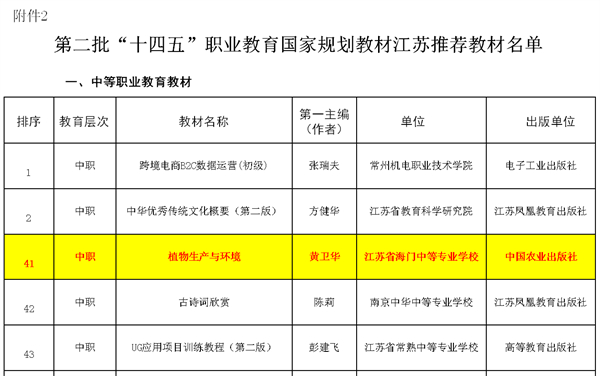 近日,江苏省教育厅公示第二批“十四五”职业教育规划教材评选结果,我校黄卫华老师主编的《植物生产与环境》成功入选江苏省规划教材,并获推荐参评“十四五”第二批国家级职业教育规划教材。