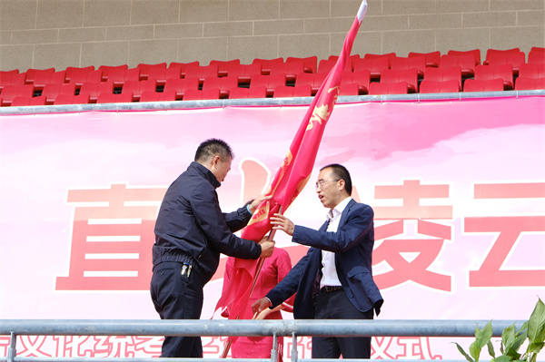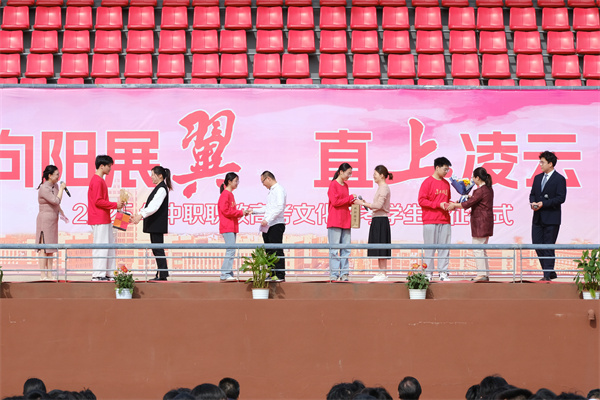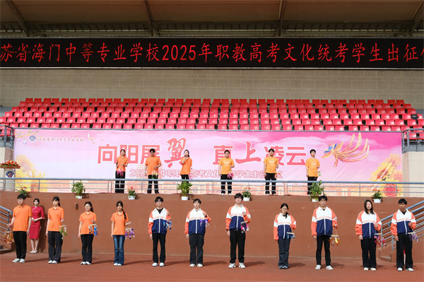 黄颖泉为财贸系、电信系出征授旗,并宣布:“江苏省海门中等专业学校2025年中职职教高考文化统考出征!”