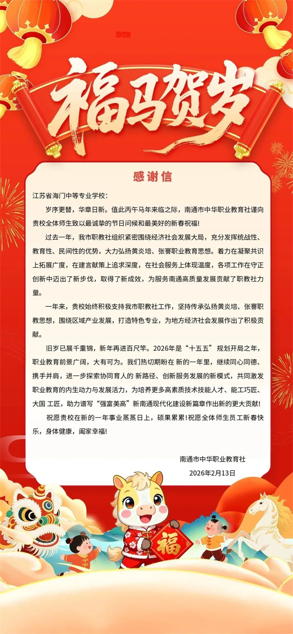 一份肯定:海专贡献,写入南通职教答卷 这既是对海门中专坚持正确办学方向、传承职教先贤思想的认可,也是对海门中专扎根区域产教融合、服务地方经济发展的褒奖,更是对全体海专人的莫大鼓舞。 一份传承:职教思想,海专热土落地生根 海门中专始终是张謇“学必期于用,用必适于地”思想的传承者,也是黄炎培“手脑并用”“敬业乐群”理念的践行者。这封感谢信,见证了海门中专与南通职教社同心同德、同向发力的坚实足迹。 一份展望:丙午马年,策马扬鞭奔腾向前 这是一封感谢信,更是一份“协同育人”的邀约函。感谢南通市中华职业教育社的信任与厚爱,海门中专将以此为动力,不忘职教初心,牢记育人使命,在传承中创新,在协同中突破,在奔跑中开创新辉煌!