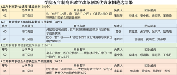 近日,江苏联合职业技术学院公布五年制高等职业教育教学改革创新优秀案例遴选结果。海门分院共有5项成果被认定为学院优秀案例,入选数量位居前列,充分展示了海门分院在五年制高职教育教学改革领域的创新实力和扎实成效。